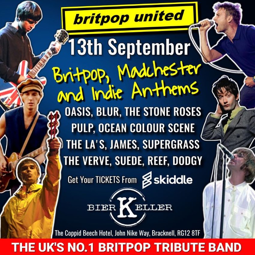 Calling all BRITPOP, MADCHESTER & INDIE Fans... The UK’s No.1 Britpop Tribute Band, “BRITPOP UNITED” will be performing live @ BIER KELLER AND APRÈS, Bracknell on Saturday13th September 2025.Formed in 2017, the 4-piece band take audiences on an energy packed journey back to the 90’s. You’ll be getting the authentic sound & vibe of anthems by Oasis, Blur, The Stone Roses, Ocean Colour Scene, Pulp, Supergrass, Suede, The Verve, The Wannadies, Happy Mondays, The La’s, and many more.