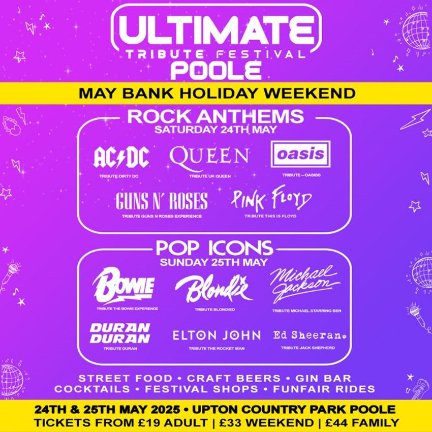 Bringing you the ULTIMATE FESTIVAL in Poole!!!! Join Ultimate Tribute Festivals Poole for the Ultimate Bank Holiday Weekend on 24th and 25th May 2025 at Upton Country Park Poole!! www.ultimate-festivals.com Ultimate Tribute Festival on 24th and 25th May with top tributes from Queen, Oasis, ACDC, Pink Floyd, Guns n Roses, Blondie, Michael Jackson, David Bowie, Duran Duran, Ed Sheeran and Elton John!! www.ultimate-festivals.com ----------------------------------------------------- * SATURDAY - ROCK ANTHEMS * Car Park opens at 1pm Gates open at 2pm 9.40pm – 11.00pm ACDC - Dirty DC 8.00pm – 9.10pm Pink Floyd Tribute - This is Floyd 6.10pm – 7.30pm Queen Tribute - UK Queen 4.20pm - 5.40pm Oasis Tribute - Oasiss 2.30pm - 3.50pm Guns n Roses Tribute - Guns n Roses Experience ----------------------------------------------------- * SUNDAY - POP ICONS * Car Park opens at 1pm Gates open at 2pm 9.45pm – 11.00pm Duran Duran Tribute - Duran 8.15pm - 9.15pm Michael Jackson Tribute - Michael Starring Ben 6.40pm – 7.50pm David Bowie Tribute - The Bowie Experience 5.10pm – 6.10pm Blondie Tribute - Blondied 3.40pm - 4.40pm Ed Sheeran Tribute - The Ed Sheeran Experience 2.15pm - 3.15pm Elton John Tribute - The Rocket Man ----------------------------------------------------- Tickets are available from www.ultimate-festivals.comURLs: Facebook: https://go.evvnt.com/2951623-2?pid=269 Instagram: https://go.evvnt.com/2951623-3?pid=269