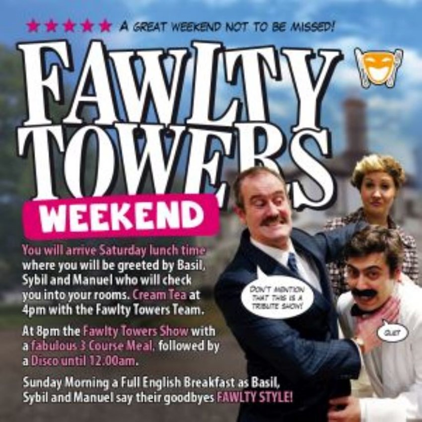 You will arrive Saturday lunch time where you will be greeted by Basil, Sybil and Manuel who will check you into your rooms.Afternoon Tea will be served at 4.00pm with the help of the Fawlty Towers TeamAt 8.00pm the Fawlty Towers Show will commence, and you will enjoy a fabulous 3 Course Meal, followed by a Disco until 12.00amSunday Morning a Full English Breakfast as Basil, Sybil and Manuel say their goodbyes FAWLTY STYLE