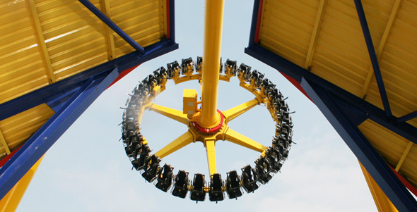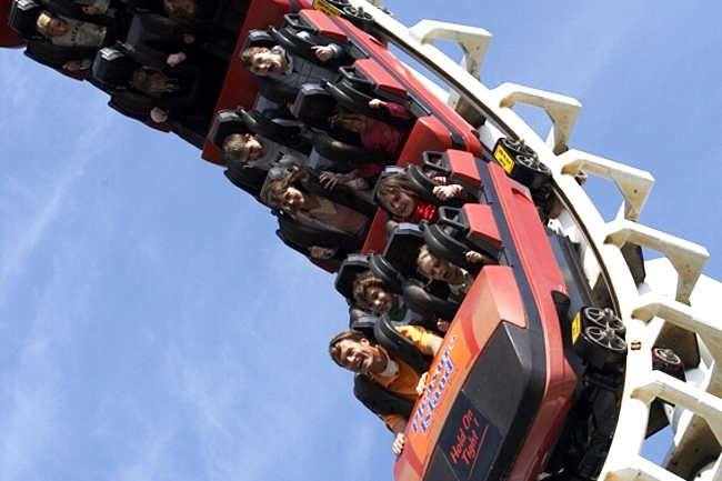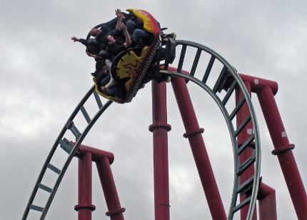 ColossusRiders flung into a record breaking 10 loops of fear at 65 kph. 120 jockey wheels of NASA‐developed materials tenaciously grip 850 metres of proximity‐sensor monitored track. Supermagnets await braking commands from awesome processing software. 2 minutes feel like 2 hours.Nemesis Inferno77 kph comes up too soon. G's…