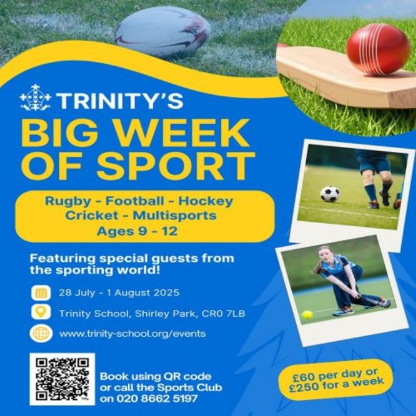 Trinity School is excited to be launching its first ever summer holiday sports camp, with ‘Trinity’s Big Week of Sport’ this JulyWith a focus on each of the major sports across the five days, the Big Week of Sport is a perfect opportunity for boys and girls aged 9 to 12 to experience life as a sportsperson at TrinitySessions will be delivered by Trinity School’s ‘Heads of Sport’, alongside other Trinity coaches and current 1st team stars, with special guests from the world of sport joining for masterclasses and Q and A throughout the weekSign up for individual days, or a full week (for a discount), and take your sport to the next level!