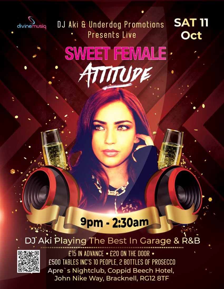 Sat 11th Oct - π€ Sweet Female Attitude Live + DJ Aki β Apres! π¨ UK Garage + 90s R&B Party π¨ π₯ Since the mid-90s, Garage classics have lit up dance floors across the UK. Weβre bringing you the ICONIC Sweet Female Attitude performing "Flowers" and more π₯ On the decks: π§ The legendary DJ Aki, spinning the very best of 90βs R&B and Garage anthems all night long. π AprΓ¨s Doors: 9PM π Advance Tickets: £15 (+bf) πͺ On the Door: £20 π« Book now π https://wegottickets.com/event/658866 βΌοΈ Advance tickets highly recommended β entry NOT guaranteed without one π A valid photo ID is required as a condition of entry.