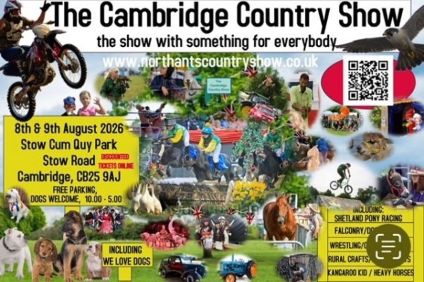The Cambridge Country Show will be back this year even bigger and betterWhether you be a Country Show fan coming to watch horse displays, see amazing falconry displays or watch motorbike stunts, an avid foodie, a dog lover, want loads for the kiddies to do, love living history or simply want a fun filled day out, our shows are for youSupport small producers and handmade with some wonderful shopping experiencesWatch and admire our Rural Crafters demonstrating all day and making some pretty amazing things or why not enter your dog into our Dog Shows with Cambridge We love DogsThere is also something for every music lover out thereEnjoy lunch listening to some up and coming musical talentWe have a variety of shows within shows to keep young and old occupied with excellent main ring attractions, Cookery Demo's, some wonderful and unique children's attractions, Festivals of Cars, this year there will be a living history camp, Horse Displays the list is endless