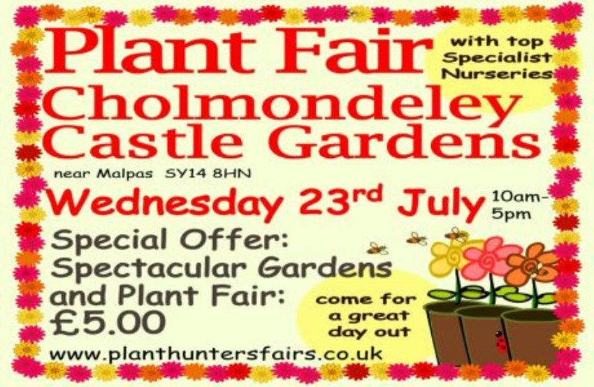 The gardens are located between A41 and A49 (SY14 8ET for Satnav)Dogs on leads welcomeRefreshments availablePlease see www.planthuntersfairs.co.uk for full details including a list of the nurseries attending