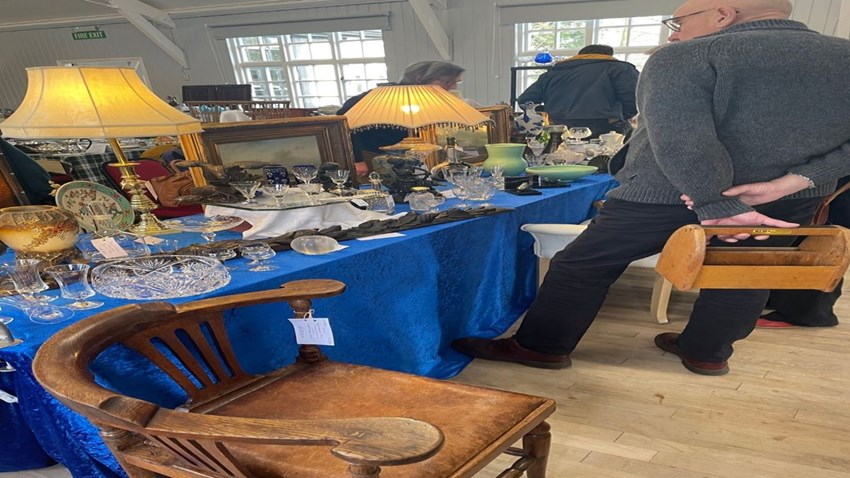 Popular for over 45 years , this 35 stall fair is a great source of stylish and interesting antiques and vintage items As seen on the BBC celebrity antiques road trip , it is always worth a visit Free car parking at the victory hall , excellent catering and cash admission is only £1.50 each