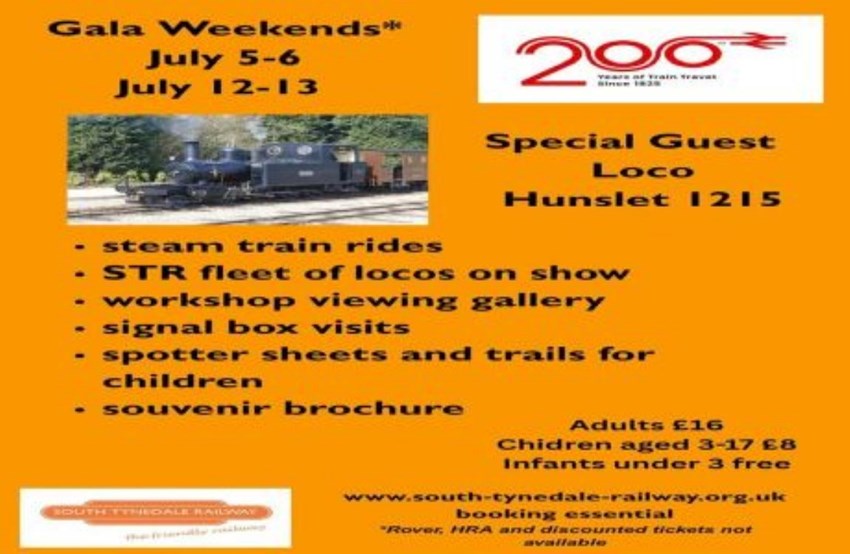 The chuff of the pistons, the blast of the whistle, the scent of coal smoke in the air and the fabulous scenery of the South Tyne Valley, make for a great day out for families and enthusiasts alike at our steam gala weekendVisiting locomotive 1215, a rare and historic loco which first saw service in the first world war, will be visiting from its home at Apedale Light Railway in Staffordshire and will be taking passengers up the line to Slaggyford and back accompanied by one of the steam locos from South Tynedale Railway's own fleetLots of other historic locos will be on show at this nostalgic Railway 200 event, which commemorates the opening of the Stockton and Darlington Railway in September 1825Our volunteers will be on hand to tell you all about the locos interesting histories and there will be lots of photo opportunities tooBook yourself a tour of the signal box to find out how the levers control the signalling system and visit the mezzanine level of the engineering building to have a peek into the workshop itself and find out about the history of the railway from our displayWin yourself a badge by solving the children's trail and treat yourself to some refreshments in the main cafe at Alston or the Little Buffet Car at SlaggyfordPre booking essential to be sure of a seatYour ticket includes free access to the mezzanine in the workshopFree signal box tours will be booked on the day on a first come first served basis, numbers are limited for safety reasonsTrains depart from Alston at 10:30, 13:00 and 15:00 Adults £16 Children (aged 3 – 17) £8 Infants (aged under 3) free Our site and our trains are wheelchair accessible and all dogs are welcomePlease note discounted tickets (except registered carers) are not valid for these gala eventsAll journeys will be starting in Alston, tickets for travel will not be available at SlaggyfordBooking now via our website