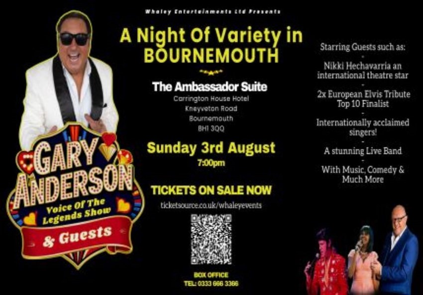 Get ready for a night of unforgettable entertainment in beautiful BOURNEMOUTH in The Ambassador Suite! with the one and only Gary Anderson and his guests! Gary a professional singer, comedy impressionist, and one of the UK theatre's most beloved performers! With an incredible 39-year career touring major theatres as part of one of the country's top Rock and Roll Variety Shows, Gary brings his unique talent and showmanship to the stage in his very OWN show like no other