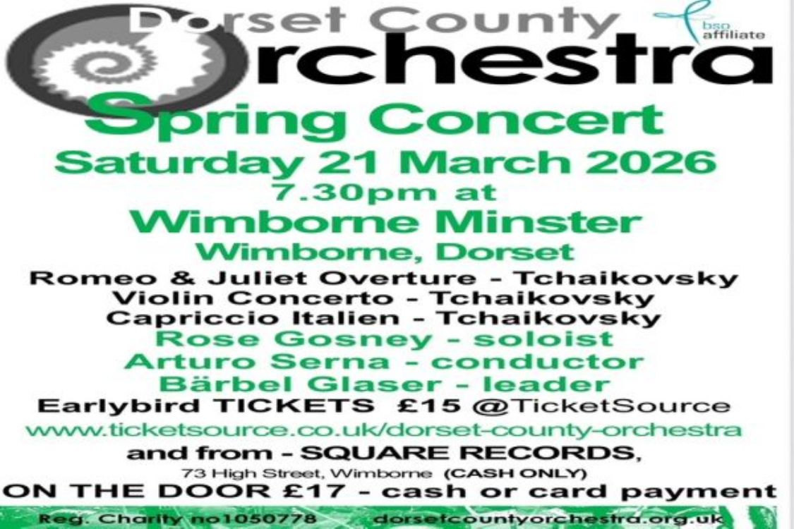.Dorset County Orchestras popular Spring concert at Wimborne Minster Church features talented local violinist Rose Gosney performing Tchaikovskys wonderful Violin Concerto. The orchestra will also perform Tchaikovskys Romeo and Juliet Overture and Capriccio Italien. Under the baton of Arturo Serna and leader…