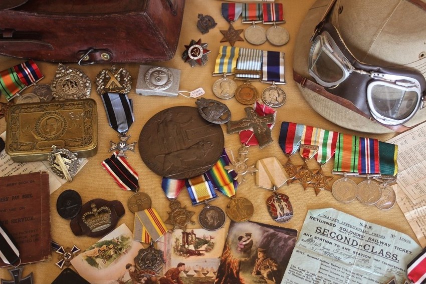 Indoor military antiques and collectibles fair, medals, badges, uniforms, hats and helmets, weapons, ordnance, books swords bayonets, documents, photographs, etc