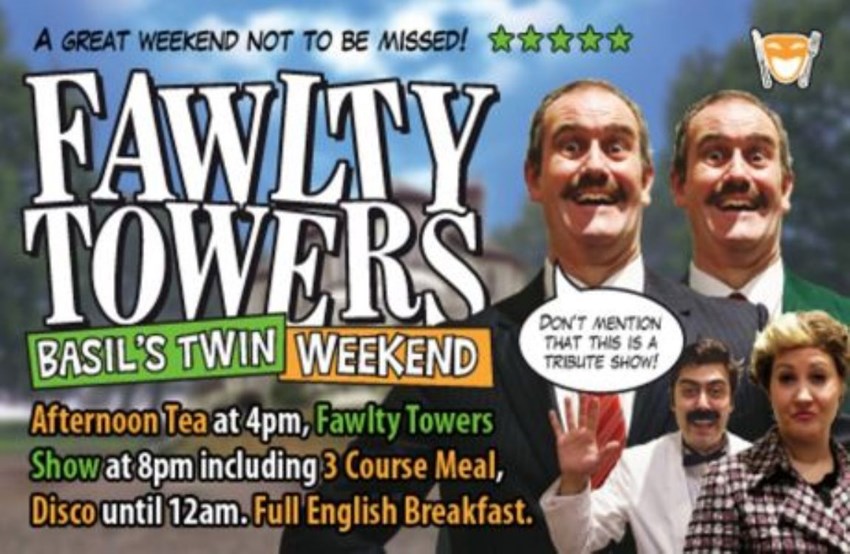 You will arrive Saturday lunch time where you will be greeted by Basil, Sybil and Manuel who will check you into your rooms.Afternoon Tea will be served at 4.00pm with the help of the Fawlty Towers TeamAt 8.00pm the Fawlty Towers Show will commence, and you will enjoy a fabulous 3 Course Meal, followed by a Disco until 12.00am