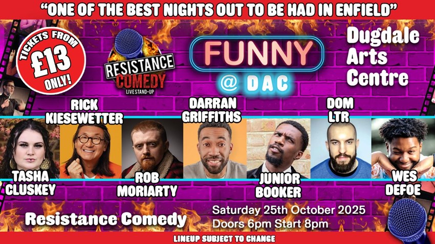 📅 Date: Saturday 25th October 2025 📍 Venue: Dugdale Arts Centre, Enfield Town 🕕 Doors Open: 6:00 PM | Showtime: 8:00 PM 🎟️ Tickets: £13 / £15 📞 Box Office: 0800 640 3928 👉 Book Online: https://www.dugdaleartscentre.co.uk/whats-on/resistance-comedy-presents-funny-dac