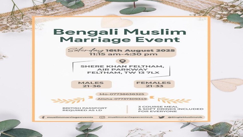 Muslim Marriage Event in London for Bengali Muslims on Saturday August 16th 2025 at 11:30 am at Shere Khans, Park Way, Feltham, TW13 7LX