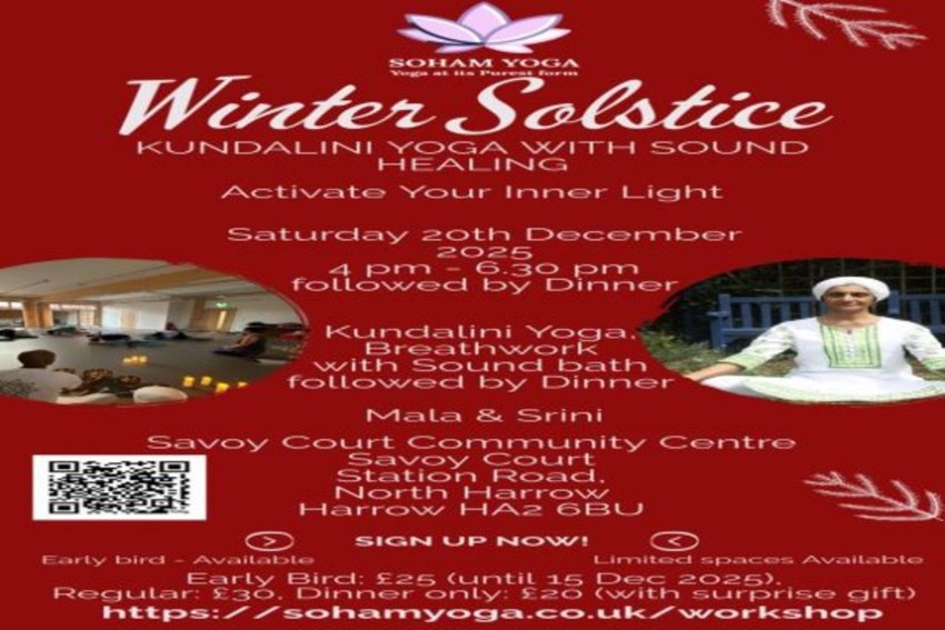 Combining Kundalini Yoga practices and sound bath resonance enhances the natural mindfulness, energetic awakening, and deep inner awareness at the heart of the Kundalini traditionThis was a beautiful two-hour Kundalini session, working with movement, breath, and energy to restore balance, release blockages, and let go of what no longer serves usThrough conscious kriyas, breathwork, and meditative focus, we create space for stagnant energy to shift and flow freely once againWhen we hold on-physically, mentally, or emotionally-we interrupt this natural flow, which can leave us feeling burdened, stuck, or out of balanceKundalini practices help us reconnect with our inner vitality, clear energetic pathways, and return to harmonyDuring the session, you will 'tune in' to each chakra through the deep, resonant sounds of singing bowls specifically tuned to their frequenciesThese vibrations work synergistically with Kundalini breath and movement, stimulating the subtle energy body and supporting deep releaseThe water molecules within the fascia respond to sound, allowing the body to soften, open, and expand even moreAfter the Kundalini Yoga and Sound Bath experience, we move into Mantra Meditation , using sacred sounds to elevate consciousness, calm the mind, and anchor the energetic shifts created during practiceThe workshop closes with a deeply relaxing 10-minute immersion with master bowlsTheir low-frequency tones and resonant vibrations help guide the brain into Alpha and Theta states- Theta waves arise in very deep relaxation and meditation- Alpha waves appear during wakeful rest, a calm and present state where the mind is not processing heavilyThese frequencies support those who find meditation challenging, helping the mind settle naturally into stillnessBy the end of the session, you will feel relaxed, reset, recharged , and experience a renewed sense of free-flowing energy and inner balanceInvestment and Event Details - Date: 20 December 2025 - Time: 4:00 pm – 6:30 pm - Investment: - Early Bird: £25 - Regular: £30 - Dinner Only: £20 - Special Offer: £5 off per ticket when purchasing two or more - Location: Savoy Court Community Centre 49 Station Rd, North Harrow Harrow HA2 6BU