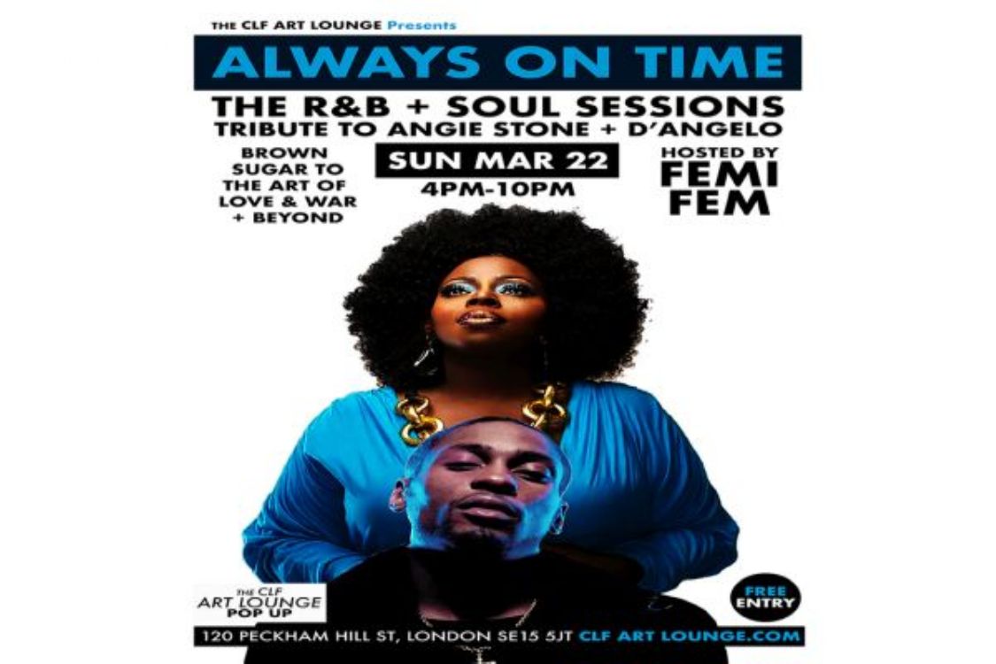 .ALWAYS ON TIME ‐ TRIBUTE TO DANGELO and ANGIE STONE Sun Mar 22 ‐ 4pm‐10pm Free Entry ‐ Legendary DJ FEMI FEM takes you back to the golden age of 90s R and B n Soul with a monthly all day…