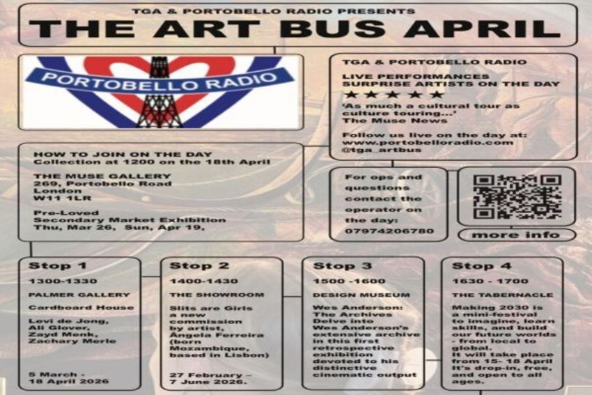 Meeting Point: Muse Gallery, Portobello Road Time: Arrive from 12:00 PM for refreshments and snacks Departure: Promptly at 12:30 PM Tour ends at 5:00 PM Follow live updates: @tga_artbus @kcawlondon