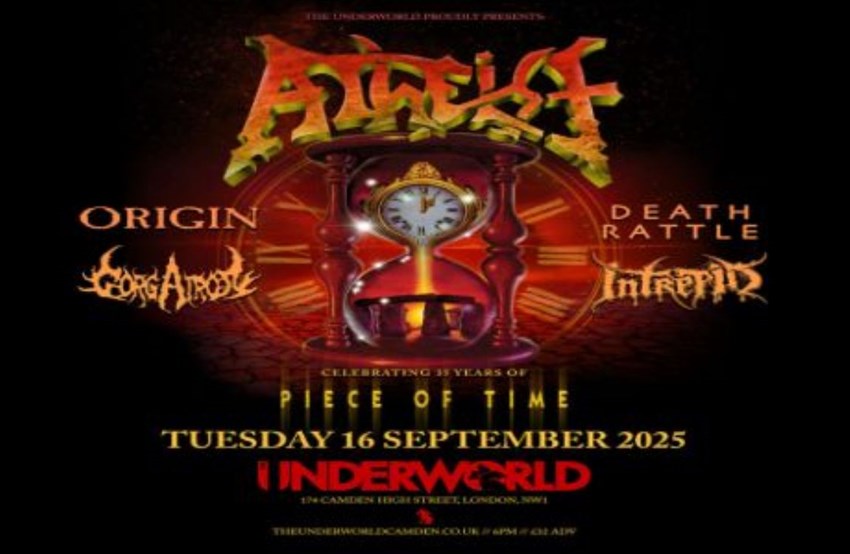 Florida death-metal ATHEIST - CELEBRATING 35 YEARS OF 'PIECE OF TIME'! with very special guests ORIGIN plus DEATH RATTLE, GORGATRON