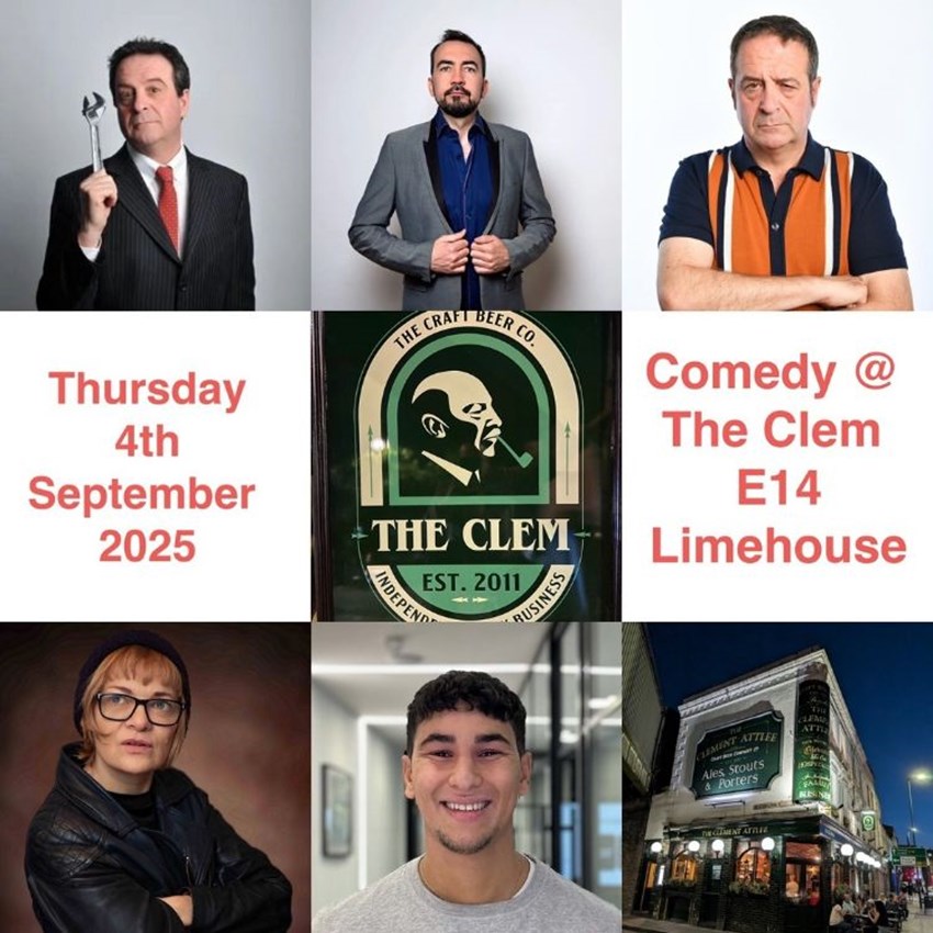 Thursday 4th September 2025 Comedy at The Clem Limehouse E14 Mark Thomas , Stephen Carlin, Sallyann Fellowes, Ily Hamdia Plus Special Guest TBC and MC Sion James Collywobblers Comedy are very excited to bring back brilliant live comedy to the legendary Craft Beer Limehouse which has now been renamed as The Clement Attlee AKA The ClemTPFKATCBC ( The Pub Previously Know As The Craft Beer Co) We bring you a fun packed comedy club for you as always including the wonderful comedy talents of the comedy legend that is Mark Thomas, the UK's finest political comedian , probably best known for the political stunts as performed on his cult Channel 4 show, The Mark Thomas Comedy Product and BBC Radio 4 Manifesto shows, brilliant Scottish comedian Stephen Carlin-One of Stewart Lee's Top 10 Best Stand Ups In The World Ever, As seen on BBC2's 'Stewart Lee's Comedy Vehicle' described by BBC Comedy Development as "The Sean Lock of his generation", Neurodiverse and LGBTQ+ comedy star Sallyann Fellowes- Winner Leicester Square New Comedian of the Year 2023, rising star Ily Hamdia Plus Special Guest TBC all hosted by your cheeky charming host and MC Sion James in the friendly cosy atmosphere of The Clem LimehousePrevious Acts Include : Jeff Innocent , Chris McCausland , Shazia Mirza , Larry Dean, Jamali Maddix , Sara Barron , Kae Kurd ,Ria Lina , Babatunde Aléshé , Tom Houghton and many more..Limited Capacity- Maximum Fun! Book Now to Avoid Disappointment Book Tickets Online Here : https://www.jokepit.com/e/42863 £12.50 Limited Early Bird Tickets £15 Advanced Ticket £20 Door Price ( Subject to availability-so highly recommend booking well in advance! For information and group reservations please contact sionjamescomedy@me.com or text 07734805817 Doors 7pm ( Seats and Tables available from 7pm ) Comedy Show 8.30pm to 11.00pm, Two IntervalsBar Open Til Midnight Please arrive at 7pm or earlier if dining and please email The Clement Attlee to reserve a table for group bookings theclementattlee@thecraftbeerco.com along with arrival time, number of people and your contact detailsVenue Address The Craft Beer Co presents The Clement Attlee Pub AKA The Clem (Upstairs) 576 Commercial Road, LIMEHOUSE E14 7JD