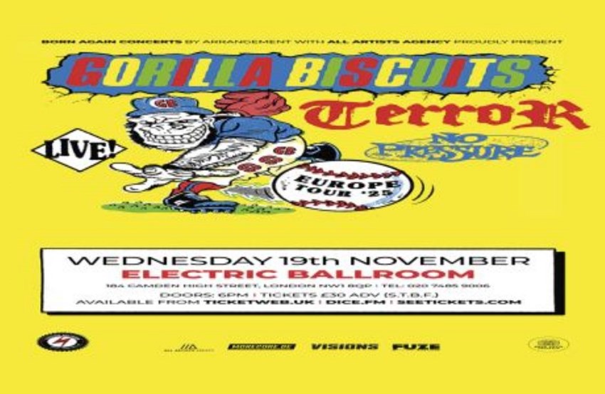 In November 2025, three generations of hardcore history will unite on one stage for an explosive co-headlining tour through Germany and Austria. With fierce energy, a clear message and an uncompromising sound, these three exceptional bands will deliver a unique line-up: The legendary Gorilla Biscuits from New York City are the blueprint of melodic youth crew hardcore since the late 1980s. Their debut album "Start Today" (1989) left its mark on generations and still symbolises positive attitude, DIY spirit and scene bonding throughout today. Their live appearances may be rare, but their shows are still an emotional state of emergency and a must for every hardcore fan. Terror from Los Angeles have been one of the most important modern hardcore bands for over 20 years. Since they started in 2002, they became famous all over the world for their brutal live shows and strong attitude. With albums such as "Keepers of the Faith" and "One with the Underdogs", they have shaped the scene time and time again. They combine old-school aggression with unwavering loyalty to the scene, making them the ideal band to perform with Gorilla Biscuits on this tour. The youngest band in the group, No Pressure, was formed in 2020 around Parker Cannon (The Story So Far). Showing that hardcore still goes well together with melodic arrangements. With their eponymous first album and lively performances, the band quickly became popular with fans of punk, hardcore and emo. Their sound is new and exciting, and it's attracting a new generation of hardcore fans.