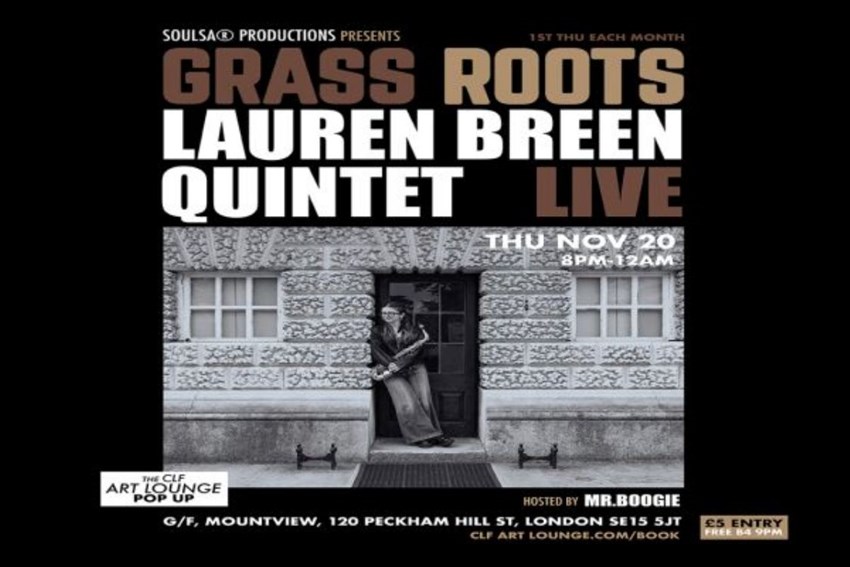 GRASS ROOTS LIVE JAZZ SESSION IS BACK!!! Thu Nov 20 (8pm-12am) - We welcome the return of Grass Roots, here to drop its well inspired monthly live jazz sessionGR delivering a hand picked line up of the finest up and coming live bands across London and way beyond for your absolute listening pleasureThis month, we present sublime Saxophonist / Bandleader / future rising star and her stunning 5 piece band - The LAUREN BREEN QUINTET (LIVE), deep in our new Intimate jazz lounge at The CLF Art Lounge Pop Up, Ground Floor Mountview