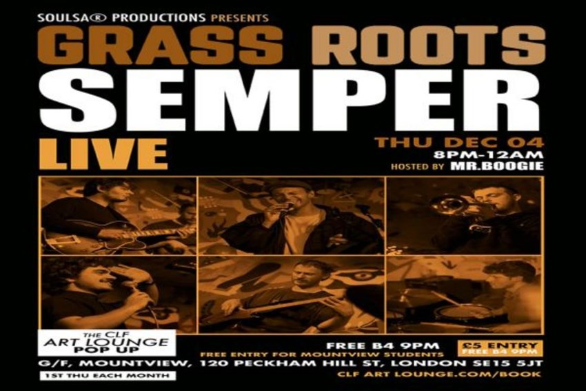 GRASS ROOTS WITH SEMPER (LIVE)!!! Thu Dec 04 (8pm-12am) - Grass Roots presents one stunner of a live show as it drops its well inspired monthly live jazz sessionGR delivering a hand picked line up of the finest up and coming live bands across London and way beyond for your absolute listening pleasureThis month, we present electrifying nu-jazz sextet SEMPER (LIVE), deep in our new Intimate jazz lounge at The CLF Art Lounge Pop Up, Ground Floor MountviewGRASS ROOTS serving as a 1st Thursday monthly platform for promising artists to 'polish their chops and play their own choons'These fresh and fully inclusive sessions are a must attend for patrons and participants alike