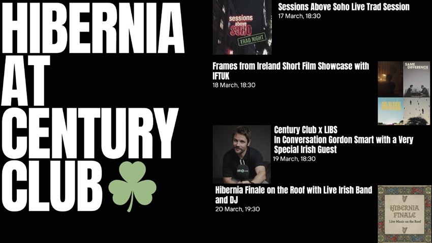Tuesday 17 March 18.30 – 22.00 | The Bar | £10 "Sessions Above Soho – Trad Night" Experience the living, evolving tradition of an Irish Session. Musicians from the film, Trad will lead the evening - and members are warmly invited to join in. Tickets: https://www.designmynight.com/uk/whats-on/live-music/hibernia-at-century-sessions-above-soho-live-trad-session?t=tickets