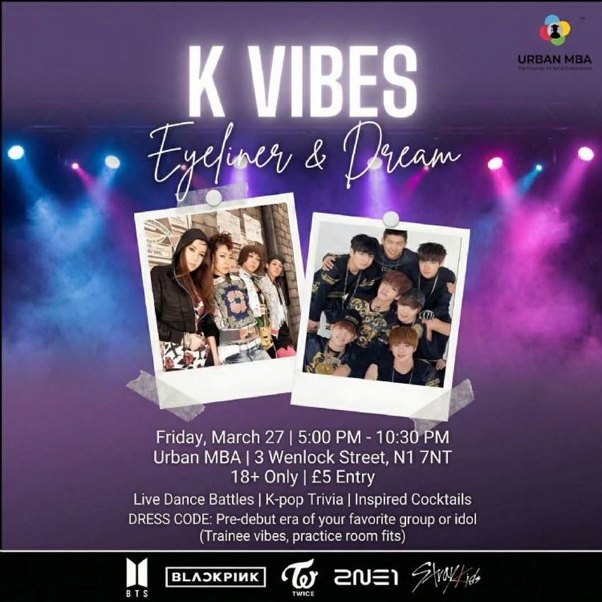 K Vibes: Eyeliner & Dream Friday, 27th March | 5:00 PM – 10:30 PM Urban MBA | 18+ Only | £5 EntryStep into the ultimate K-pop experience where nostalgia meets nightlife. K Vibes: Eyeliner & Dream is your chance to celebrate the pre-debut era magic that made your favourite idols who they are today — before the sold-out arenas, before the world tours, before the fame. Just raw talent, dedication, and that dream that started it all.