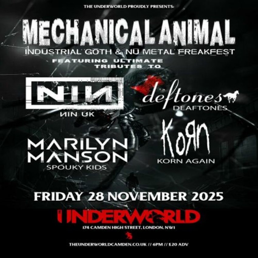 This is MECHANICAL ANIMAL! The most Freaky - Alternative tribute event in the UKGrinding faces against the harsh, cold and rusted edge of the 90’s Industrial and nu metal era! Get ready for an epic night of mind-blowing music! Underworld, Camden is hosting an unforgettable tribute Quadruple header featuring the iconic sounds of Korn, Marilyn Manson, Nine Inch Nails and Deftones Performed by tributes Korn Again, Spouky Kids, ИIN and Deaftones Brace yourself for an electrifying experience as these talented tribute bands transport you back to the golden era of alternative rock Located at Camden High Street, this in-person event promises to deliver an explosive atmosphereImmerse yourself in the heart-pounding beats and mesmerising melodies of these legendary bands as they pay homage to their iconic music catalogues Whether you're a die-hard fan or simply looking for a night of incredible live music, this is the event you don't want to missGrab your friends, put on your best rock gear, and join us for a night that will leave you screaming for an encore!