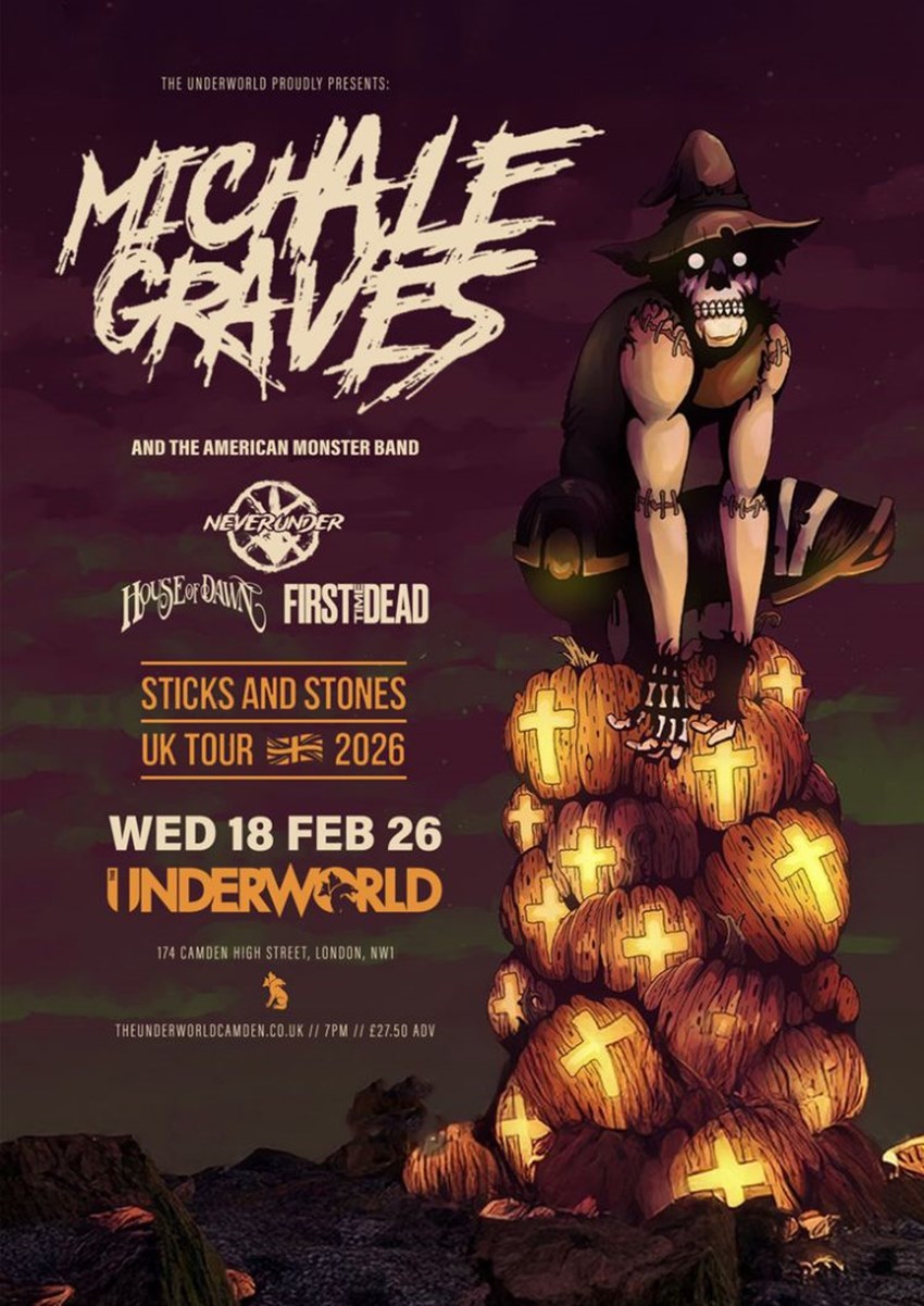 Horror punk icon MICHALE GRAVES AND THE AMERICAN MONSTER BAND - STICKS AND STONES UK TOUR 2026 with very special guests NEVERUNDER plus HOUSE OF DAWN and FIRST TIME DEADTickets https://tinyurl.com/UWgraves From £27.50 adv// 19:00