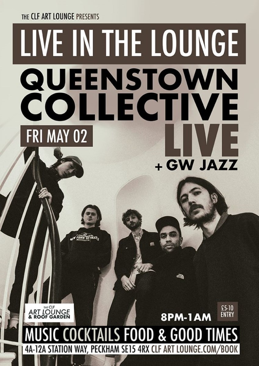 QUEENSTOWN COLLECTIVE LIVE!! Fri May 02 (8pm-1am) - Welcome to the cosmic soundscapes, melody strong, groove ridden musical stylings of QUEENSTOWN COLLECTIVE Live In The LoungePrepare yourself for 2 live sets of explosive sound, from a truly heavy band on the rise channeling the spirit of Kamasi Washington and Yussef Dayes, for your absolute souled out and blissed up listening pleasure, plus support from local selector supreme GW JAZZ, deep in our speakeasy jazz lounge at The CLF Art Lounge and Roof Garden