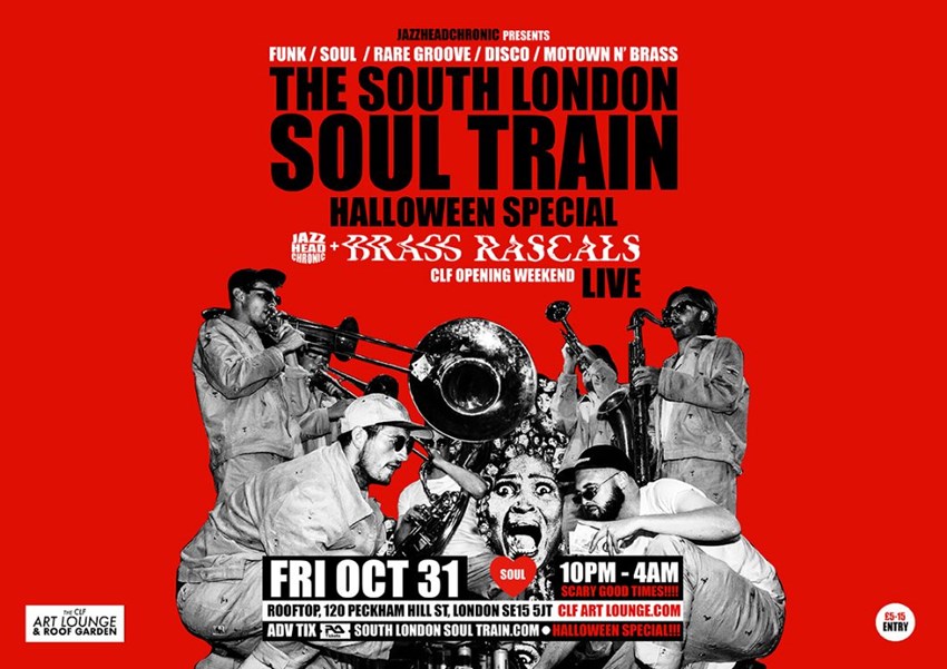 VENUE CHANGE / NOW AT MULTI STORY (Top floor PECKHAM LEVELS)! Fri Oct 31 (10pm-4am) - Have we got one scarily good time The South London Soul Train Halloween Special for you. Dancefloor nuking' funk/soul and hop party starter JAZZHEADCHRONIC joined by heavyweight party starters BRASS RASCALS (Live)dropping dancefloor killahs all night long, now taking place at the new main auditorium warehouse space MULTI STORY, top floor PECKHAM LEVELS.