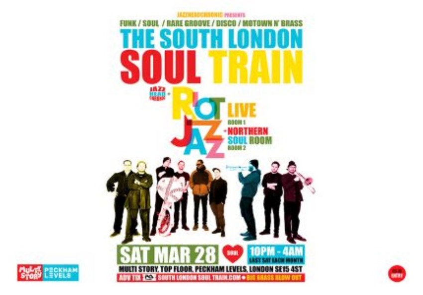 THE SLST WITH RIOT JAZZ (LIVE) + MORE IN 2 ROOMS! Sat Mar 28 - The South London Soul Train celebrates the dawn of Spring with a red hot, sure fire get down monster of a gigYour host with the eclectic funk, soul, jazz, hip hop and disco slinging most JAZZHEADCHRONIC joined In ROOM 1 by one of the best brass bands, anytime, anywhereTalking about the positively stage storming, tour de force that are RIOT JAZZ BRASS BAND (LIVE) Beware the soul shrapnel as the dancefloor goes BOOMThen in ROOM 2 / THE NORTHERN SOUL ROOM, the legendary ROB MESSER x OSCAR ROMP unleash the absolute finest in rare groove and hot shot funk and soul 45s all night long at new warehouse space MULTI STORY, top floor Peckham Levels