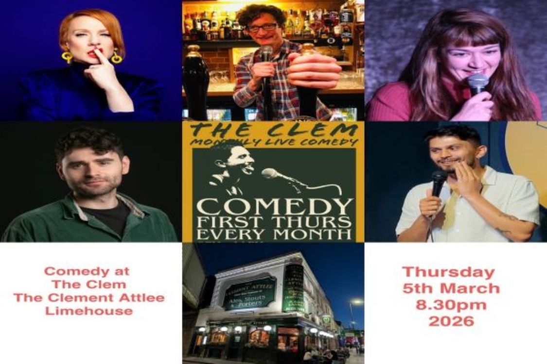 .Thursday 5th March 2026 8.30pm Comedy at The Clem Limehouse E14Sara Barron PreviewWIP Callum Mackenzie Heman Makwanna Sarah Evans and MC James DowdeswellCollywobblers Comedy bring you brilliant live comedy on the first Thursday monthly to the legendary Clement…