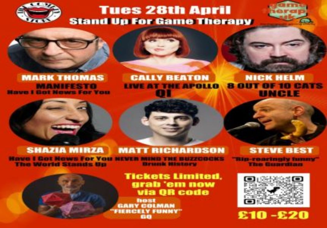 .Stand Up for Game Therapy UK join us for a fab night of comedy with an incredible line‐up of award‐winning top tv comedians MARK THOMAS CALLY BEATON NICK HELM SHAZIA MIRZA MATT RICHARDSON STEVE BEST and host GARY COLMAN. All money raised…