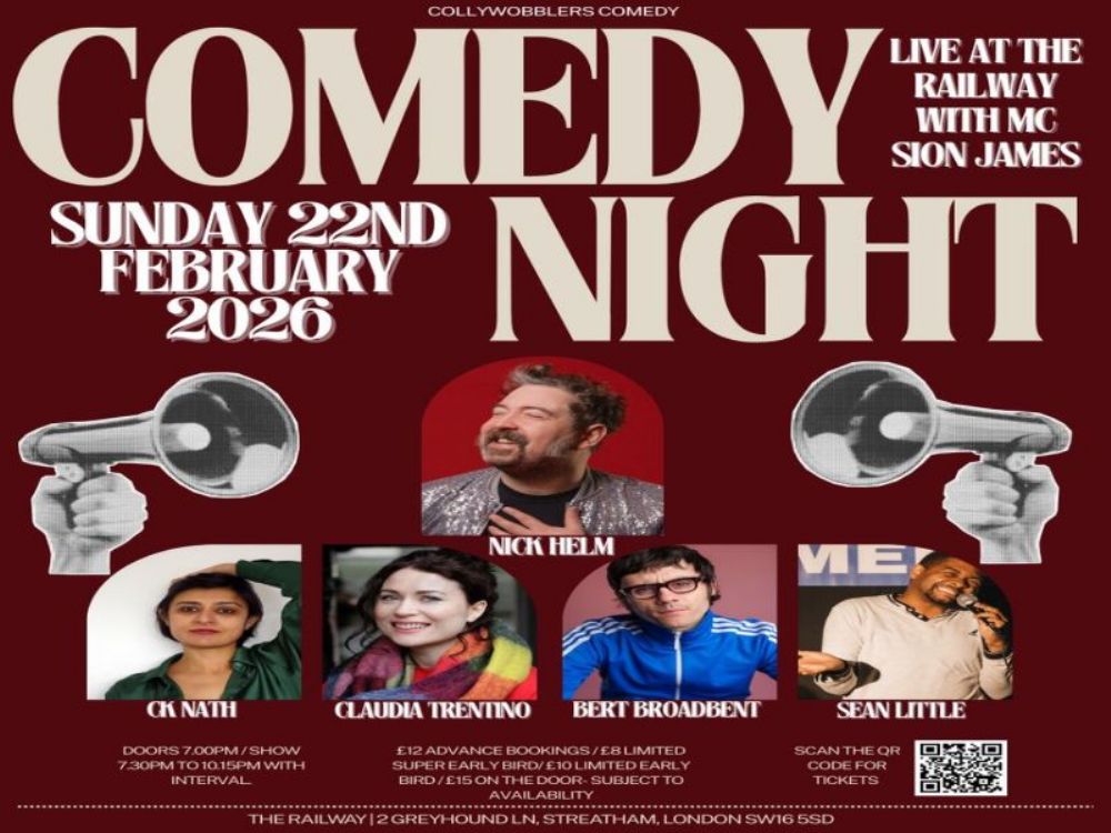 Sunday 22nd February 2026 Collywobblers Comedy at The Railway Streatham : Nick Helm CK Nath Claudia Trentino Sean Little Bert Broadbent Plus Special Guest TBC and MC Sion JamesThe Railway 2 Greyhound Lane Streatham Common London SW16 5SD www.therailwaysw16.co.ukNearest…