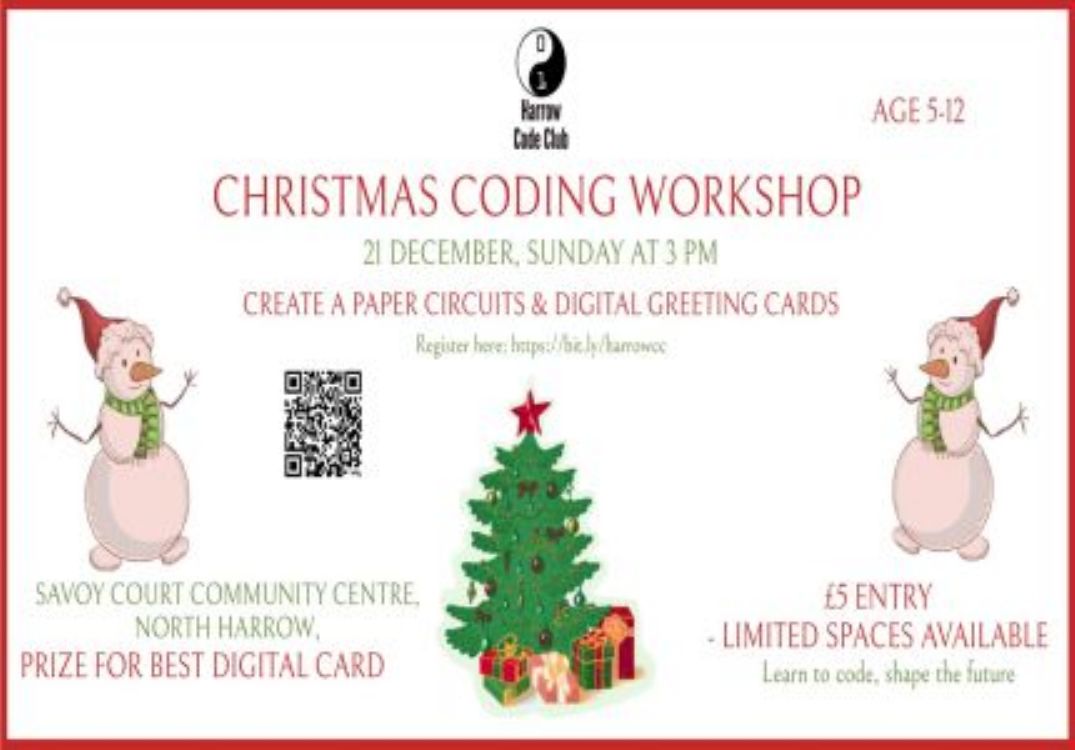 .Harrow Code Club ‐ Christmas WorkshopSunday 21st December 2025 3:00‐4:30 pmSavoy Court Community Centre North Harrow£5 entry ‐ donations welcomeLimited spaces availableLooking for a festive creative and educational activity for your childJoin us for a special Christmas Coding Workshop where children…