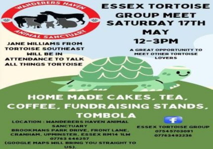 Essex Tortoise Group Meeting Essex Tortoise Group Meeting Saturday 17th May, 12pm till 3pm come and learn more about tortoises, come and meet large tortoises, Everybody welcome stalls, refreshments, tombola, homemade cakes, free admission, speakers if you want to learn more, or thinking about getting a tortoise, this is the place to be for more info contact john 07545703091 or sue 07763492236 event date Saturday 17 May venue address wanderers haven Animal SanctuaryBrookmans Park Drive, Front Lane, Cranham, Upminster, ESSEX, Essex RM14 1LW