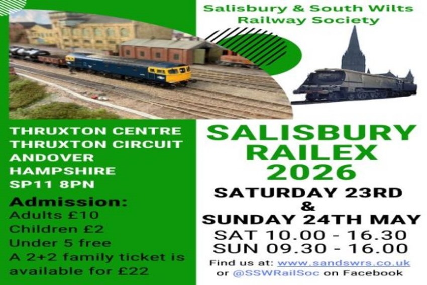 SALISBURY RAILEX 2026 Dates: Saturday 23rd and Sunday 24th May 2026 Organiser: Salisbury and South Wilts Railway Society Venue: Thruxton Centre, Thruxton Circuit, Andover Hampshire SP11 8PN Open: Saturday 10.00 am - 4.30 pm, Sunday 9.30 am - 4.00 pm Admission: Adult £10.00, Child £2.00 (age 5-16), Accompanied under 5 freeFamily 2+2 for £22