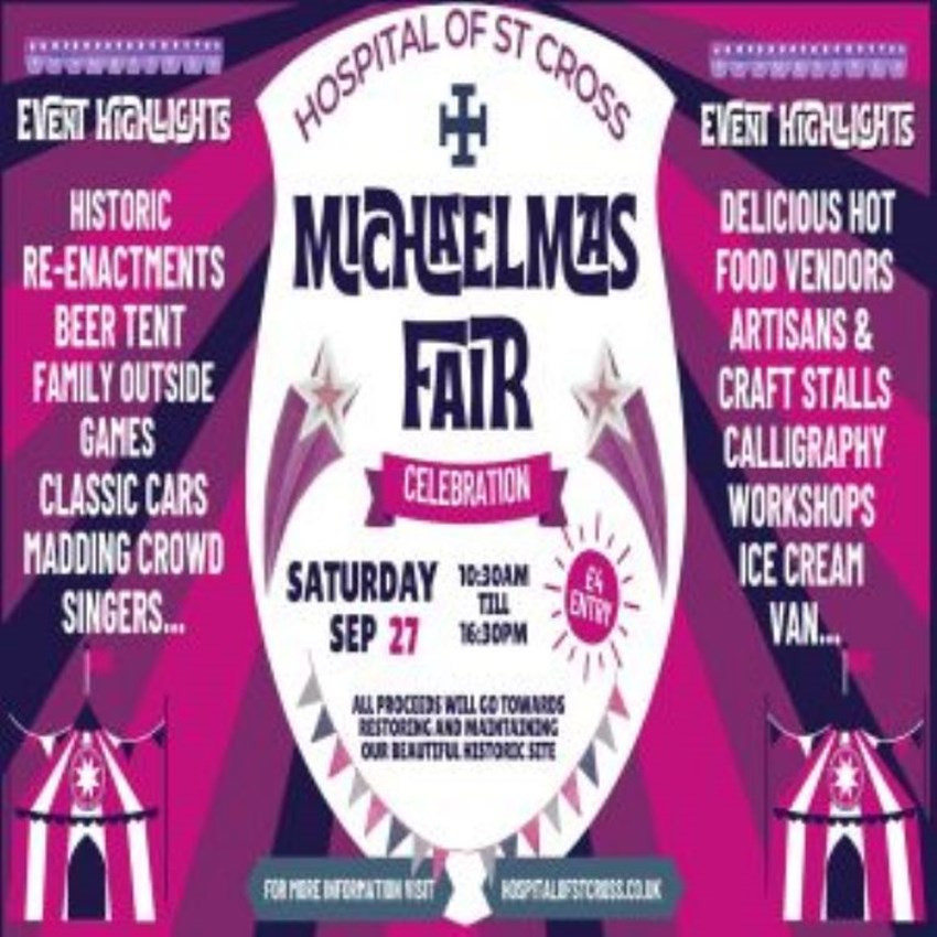 Each year the Hospital of St Cross hosts their biggest fund raising event, the much loved Michaelmas Fair; which is set at our beautiful Medieval site nestled south side of WinchesterThis late summer fayre traditionally marks the end of the agricultural season and welcomes the new one; combining the Michaelmas Feast in the Christian calendar, celebrating St Michael the ArchangelOn Saturday the 27th September, our Michaelmas Fair runs for the whole dayThe Fair promises to bring you a wonderful variety of entertainment for allThis year includes: The Free Co of Aquitaine, who are setting up a Medieval camp for a living history experience; bringing with them their tales, armoury, clothing, weaponry, special skills, and the general domestic life they experience whilst being on the move as mercenaries in the 100 year WarVisitor Participation EssentialAlongside this we have our popular French inspired family outside giant games, a jolly beer tent to whet the appetite, and plenty of hot and cold food vendors offering delicious local foods to munch on; catering for All tastesFor music we have the traditional Madding crowd singers joyfully presenting in our inner quadFor Christmas shopping, we’re offering plenty of lovely artisan and craft stalls for visitors to enjoy these selective wearsIn keeping with our Medieval theme, the highly skilled calligraphers from Winchester Cathedral will be offering informal workshops on the art of Calligraphy in the North Transept of the Chapel, alongside a medieval tent set up outside, showing the art of illuminations and medieval type for visitors to experiment withFor our classic car enthusiasts; we are pleased to invite the Austin Healy Club - New Forest, who will be eager to discuss and show their display of these elegant 50’s/60’s stylish sports carsOur site will be accessible for all to explore and wonder at the beautiful gardens, the magnificent chapel, saunter through our majestic historic halls and Tudor kitchen, then settle down in our much loved HMH Tearooms for sumptuous cake and coffeeEarly birds can get a bacon bap too at our caféOnce you are full from excellent nourishment, entertainment and cheer, please head to the Porter’s Lodge to receive your Wayfarers Dole - a morsel of wholesome bread and a swig of darkest local aleThe day runs from 10:30am - 4:30pm Admission; £4 Children under 26 - Free Disabled Access through all site To book a stall - £45 = If interested please contact: admin@hospitalofstcross.co.uk This event is run mainly by the good will of our local volunteersWe are always in need of new volunteers and would welcome any enquiry warmly: If you are interested please email: office@hospitalofstcross.co.uk if you can offer any time or expertise for us on this beautiful siteSee website for details: https://hospitalofstcross.co.uk/event/michaelmas-day-27th-september-2025/ The Michaelmas Fair is raising money for the upkeep of our beautiful ancient buildings, and for all to continue enjoying our 900 year old unique space, as well as to preserve our residential almshouse for many more future generations in need‘An extraordinary rarity, a medieval settlement still standing serene in its antique river landscape’ , ‘Here lies England’s oldest and most perfect Almshouse’; Simon JenkinsWe look forward to seeing you all at the Michaelmas Fair 2025!