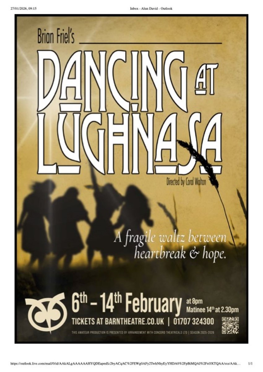 Dancing at Lughnasa runs at the Barn Theatre from Friday 6th to Saturday 14th Febuary, evenings 8pm, matinee on 14th February, 2.30pm. Tickets cost £16 from Barn Theatre box office on 01707 324300 or online at www.barntheatre.co.uk - Ends - Contact: Barbara Holgate-Stuckey