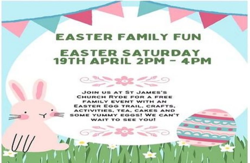 Join us at St James's Church Ryde for a free family event with an Easter egg trail, crafts, activities, tea, cakes and some yummy eggs! We can't wait to see you!