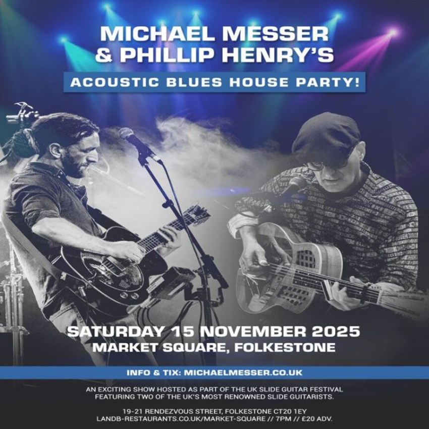 Two of the world's most celebrated slide guitarists, Michael Messer and Phillip Henry, come together for one unforgettable evening of acoustic blues mastery at Market Square, FolkestoneThis Acoustic Blues House Party invites audiences into an intimate night of stunning musicianship, soulful performances, and stories from two lifelong innovators of the slide guitarWhether you're a blues enthusiast or simply love world-class live music, this is a rare chance to see two virtuosos share the stage in full creative flow