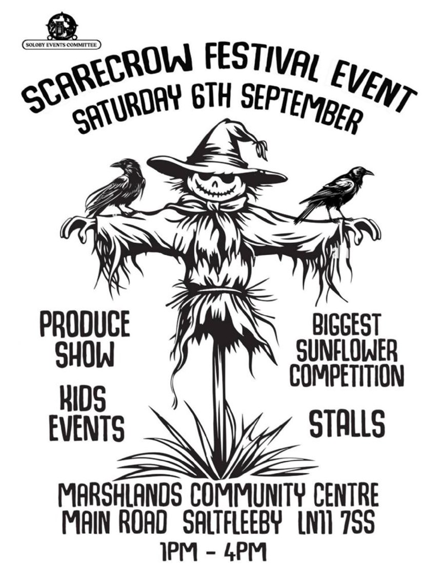 Saltfleetby Scarecrow Festival 2025Homemade scarecrows can be seen around the village NOW.. The Prize-giving FUN-DAY will be on Saturday 6th September at Marshlands Community Centre (Louth Town Football Club), Main Road, Saltfleetby, LN11 7SS, 1pm to 4pm. Free Entry, Everyone Welcome.