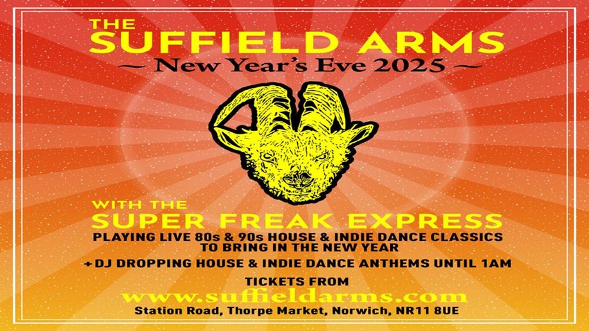 Throw your hands in the air and wave your glow stick like you just don't care - The Suffield Arms returns for another blockbusting New Years Eve Party and celebrates the heady late 80s and early 90s! The Super Feak Express will play live, setting the dance floor on fire with a set of late 80s/ early 90s house, acid and indie dance bangersBefore and after the band DJs will drop more house and indie dance anthems to keep you dancing on your feet all night