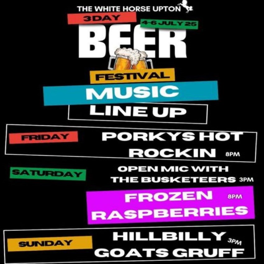 Voted the 2025 Broadland Pub of the Year, The White Horse, Upton, is hosting a live music festival from Friday 4th to Sunday 6th JulyEnjoy a selection of 30 local and regional cask ales from our garden beer marquee and pub tap room, plus a great choice of traditional and flavoured draft ciders, all at reduced festival pricesFor your entertainment, we welcome the return to Upton on Friday night of PORKY'S HOT ROCKIN' band, kicking off the party in styleSaturday afternoon we welcome on stage THE THREE BUSKETEERS, who will be entertaining you with an open mic session, followed in the evening by THE FROZEN RASPBERRIES, a four piece funky fun loving rock bandThe festival continues through Sunday afternoon with another White Horse regular, the sensational HILLBILLY GOATS GRUFFEnjoy a selection of festival basket food all weekend, and of course our usual extensive range of wines, spirits lagers and soft drinksWhatever the weather, we've got you covered in our large beer garden or spacious marquee, so come down to Upton and join in the fun!