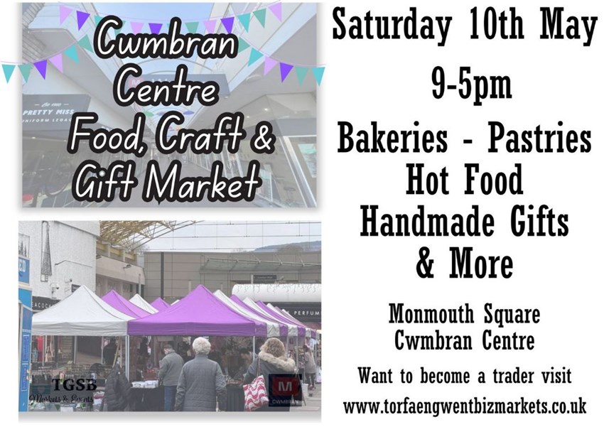 Cwmbran Centre Food Craft and Gift Market - Monmouth Square Cwmbran Town CentreHomemade bakes and cakes handmade crafts, gifts and clothing