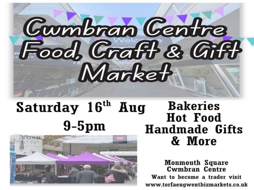 Cwmbran Food, Craft and Gift Market Location: Cwmbran town centre Date: Saturday 16th Aug Time: 9-5pm Come along to a friendly local market full of great finds!