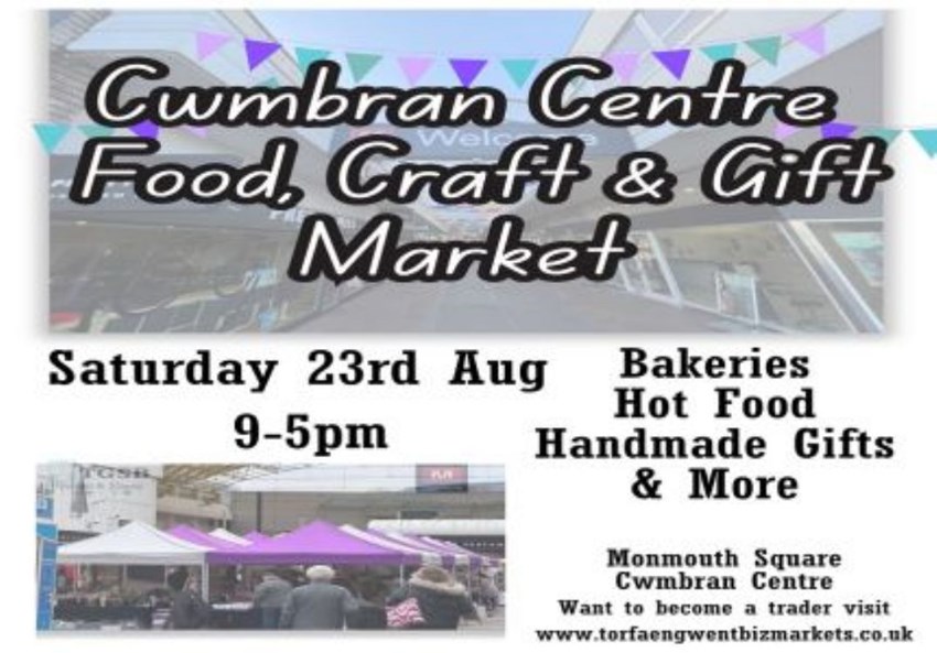 Cwmbran Food, Craft and Gift Market Location: Cwmbran town centre Date: Saturday 23rd Aug Time: 9-5pm Come along to a friendly local market full of great finds!