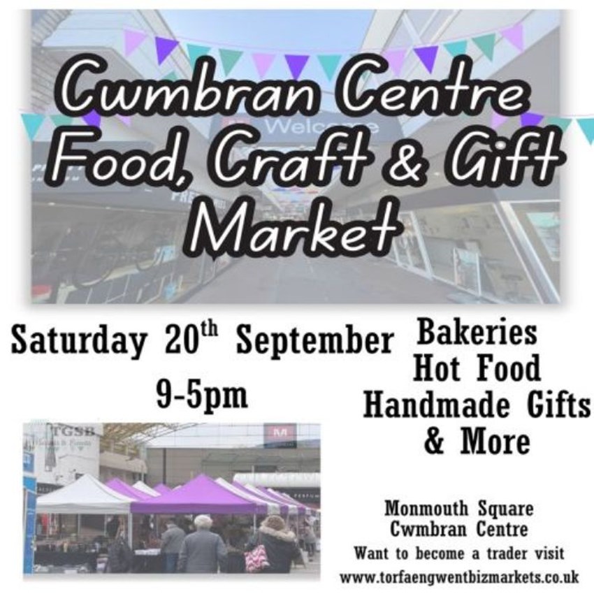 Cwmbran Food, Craft and Gift Market Location: Cwmbran town centre Date: Saturday 20th September Time: 9-5pm Come along to a friendly local market full of great finds!