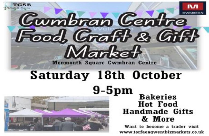 Cwmbran Food, Craft and Gift Market Location: Cwmbran town centre Date: Saturday 18th October Time: 9-5pm Come along to a friendly local market full of great finds!