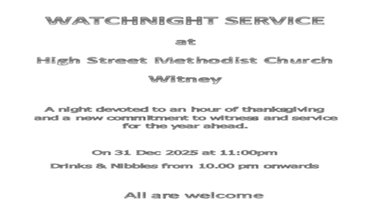 .Watch Night Service ‐ as we enter 2026 in Gods house with Gods people ‐ thanking Him for His faithfulness mercy and grace through 2025 and looking ahead for 2026 committing ourselves for His plans and purposes for Witney.…